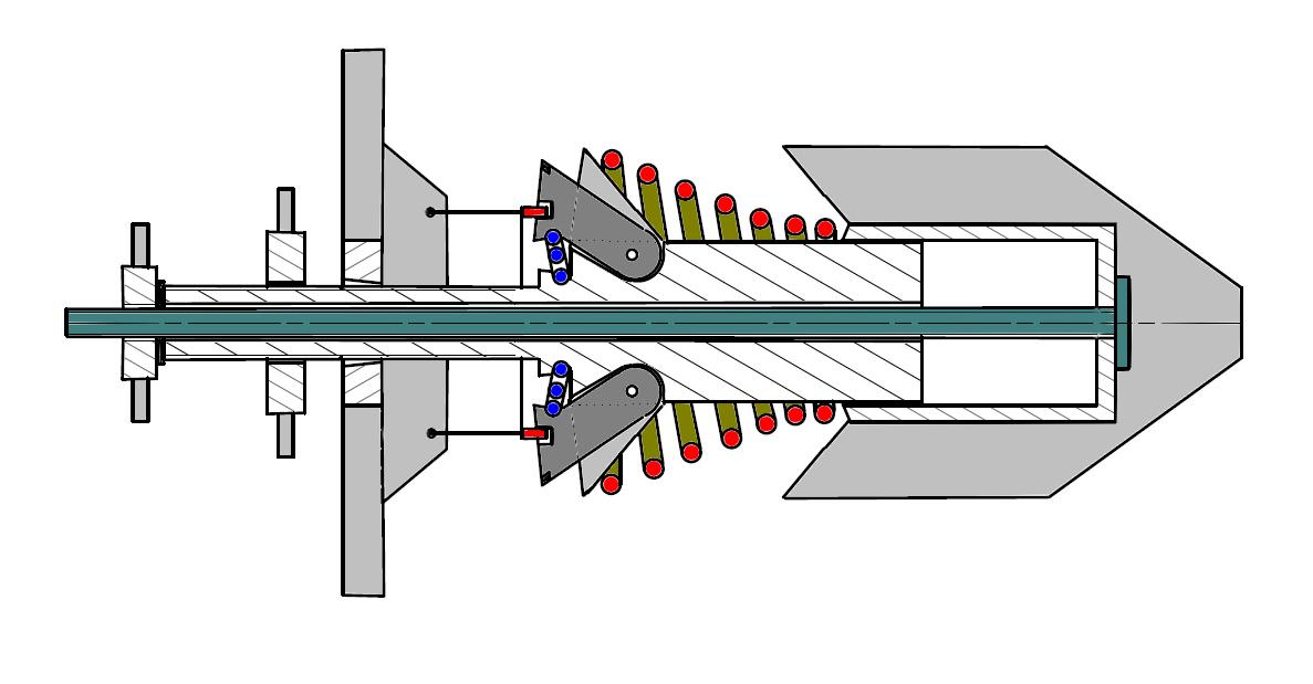 plug is pushed in the pipe the cross bar (15) will hit the rugged end of the pipe and the also stopped trigger ring (9) releases all six