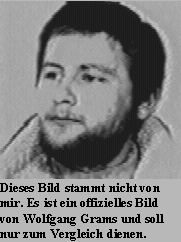 Einer der Hauptakteure auf dem Hof der Schabenbergers war auch Wolfgang Grams, der sich mir in der "DDR" allerdings unter dem Namen Thomas Scheutzlich vorgestellt hatte und am Springsee zum Terroristen ausgebildet worden war, aber Namen ändern diese Herren wie andere die Hemden. Er begleitete mich in Berlin, München und Frankfurt. Er könnte etwas zu den Vorgängen auf dem Hof der Schabenbergers sagen, zu dem Mord an meiner Freundin Gabi Ulig (nicht zu vergessen den Mord an meiner Freundin Christine Kappelt/Gerber zuvor), zu dem Mord an Professor Beckurts, zu dem Mord an meinem Onkel Robert Mikolajek in München und zu dem Bombenattentat auf dem Oktoberfest, bei dem auch ich ein Opfer werden sollte. Auch kannte er die Macher der Stelzer AG und der W&W Pumpen AG. Das BLKA vermied es peinlichst, ihn in meinem Ermittlungsverfahren zu befragen. Jetzt wissen sie außerdem, warum er bei seiner Verhaftung unbedingt erschossen werden mußte - er wußte zu viel.