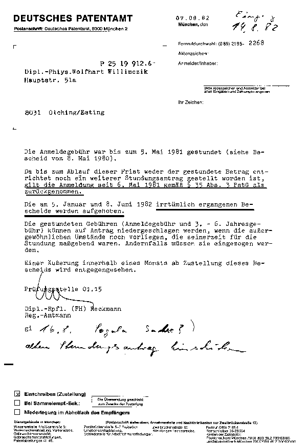 Das Deutsche Patentamt hob nachträglich die Bescheide, die die Existenz meiner Patentanmeldung "Hubkolbenmaschine mit elektrischem Triebwerk, Hubkolben-Lineargenerator" auswiesen, einfach wieder auf und zerstörte so mit einem Wisch meine Patentanmeldung, für die schon mein Onkel gestorben war, weil er sie angemeldet hatte: (Auf diese Idee ist das Patentamt aber nicht von alleine gekommen, das BLKA/SSD hatte das Patentamt vorher besucht, wofür ich jetzt sogar einen schriftlichen Beweis habe. Wollen sie mehr wissen?)