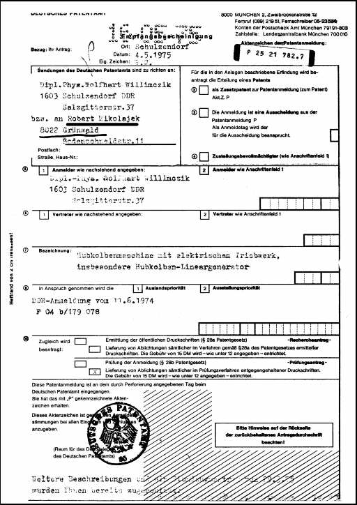Außerdem liegen hier die Gründe dafür, warum mir später - nachdem ich alle Anschläge des SSD in der BRD überlebt hatte - das Deutsche Patentamt in München durch ein "Versehen" meine Patentanmeldung Hubkolben-Lineargenerator zerstörte und damit die Tür für die Patentanmeldung eines Herrn Stelzer öffnete.